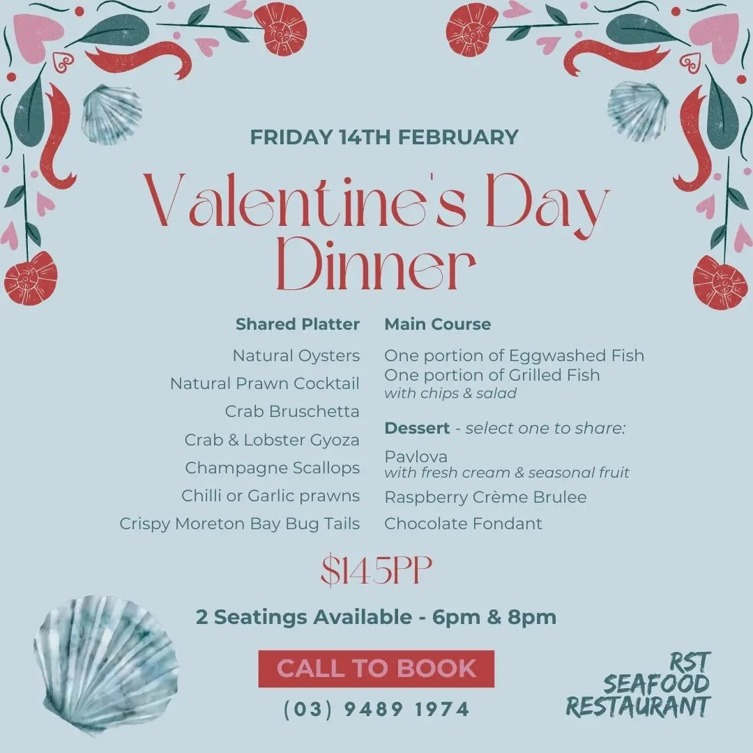 Call us at (03) 9489 1974 to reserve your spot or visit www.rstseafoodrestaurnt.com to book